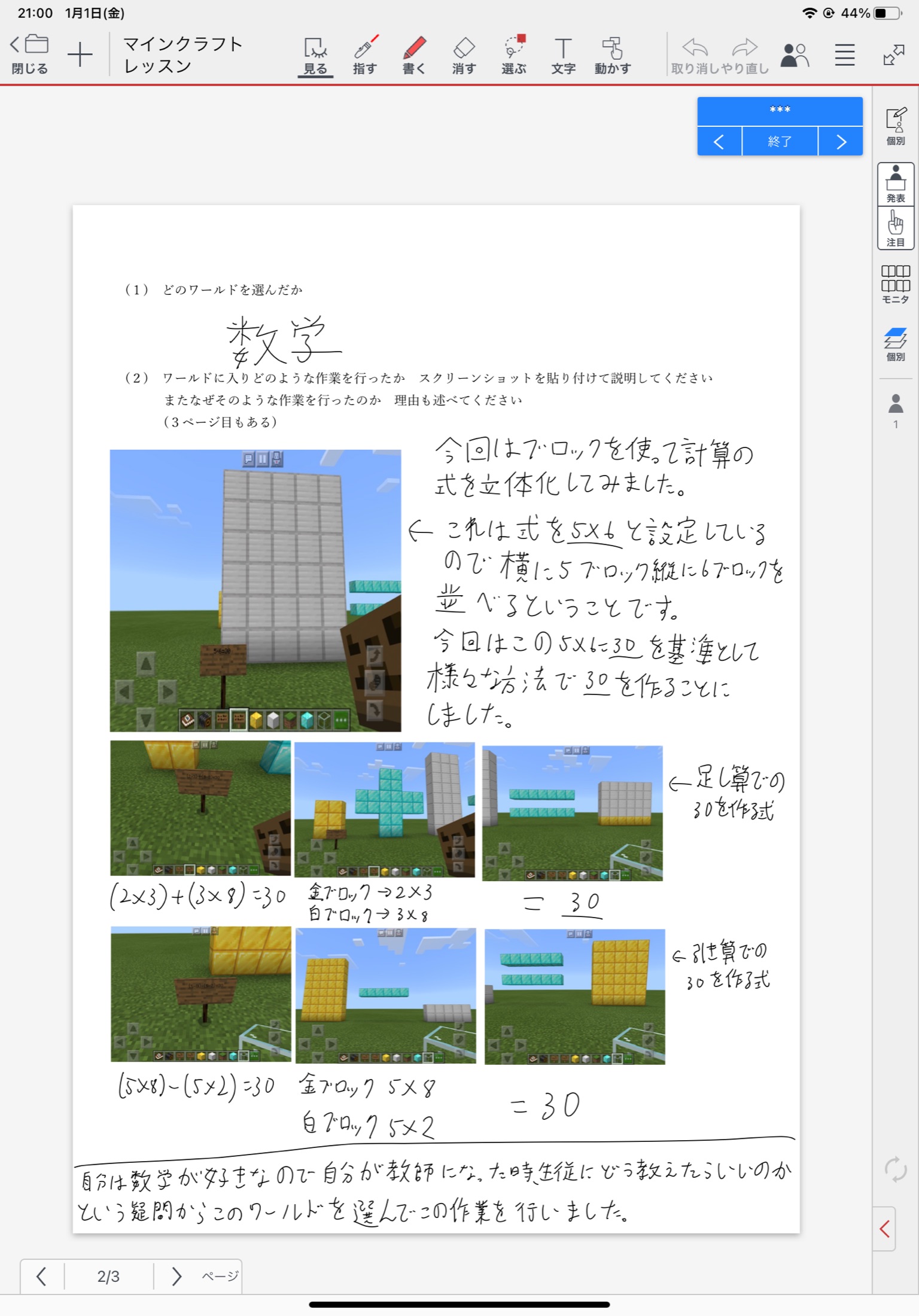冬休みの宿題として,Minecraft Education Edition のマインクラフトレッスンの教科から1つ,またかHour of Codeのプログラミングのいずれかを自分で選んで、取り組んだことをまとめなさいという課題を課したところ、クリエイティブな作品がたくさん提出された。印象に残ったものを紹介する。